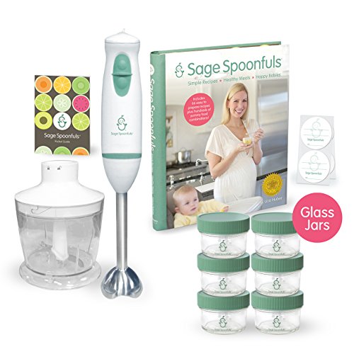 - Includes: Immersion blender/food processor, Sage Spoonful's 227pg recipe and guide book, 6 4oz glass storage jars with screw on lids, Sage Spoonful's pocket guide. If bought separately, this is a $90 sugg retail value